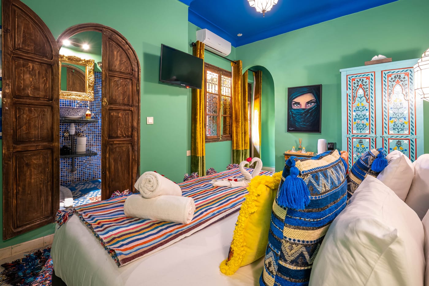 La Suite Ocre Shems du Riad Dar Khmissa Marrakech vous offre une expérience raffinée et charmante. Avec un lit king size, un salon avec télévision, une salle de bain en tadelakt ocre, et des commodités telles qu’une cafetière Nespresso et un accès WiFi rapide, cette suite intime vous promet confort et détente. Profitez de son atmosphère marocaine traditionnelle et réservez dès maintenant pour une escapade élégante au Riad Dar Khmissa.