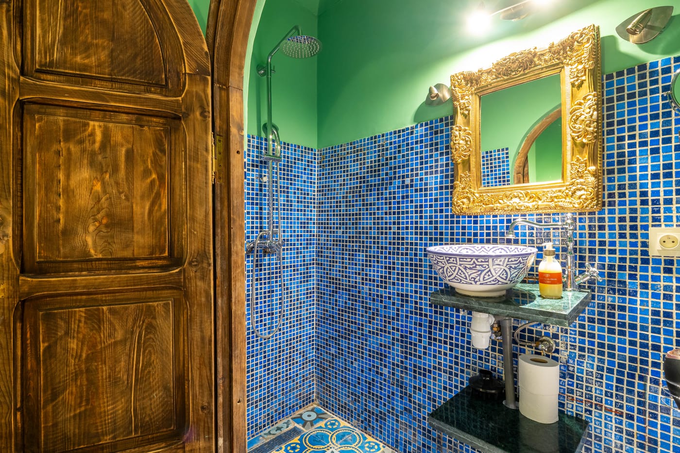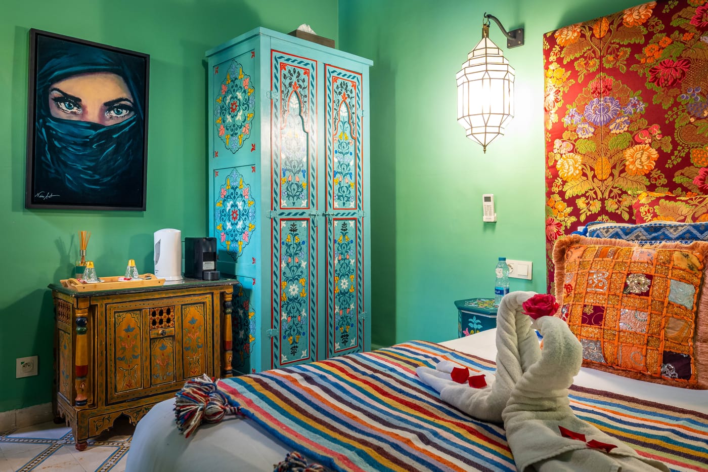 Découvrez la Chambre Moucharabieh : un refuge de luxe au dernier étage avec vue sur la terrasse. Lit king size ou lits simples, équipements haut de gamme incluant salle de douche privée, télévision, cafetière Nespresso et plus encore, pour un séjour confortable et élégant.