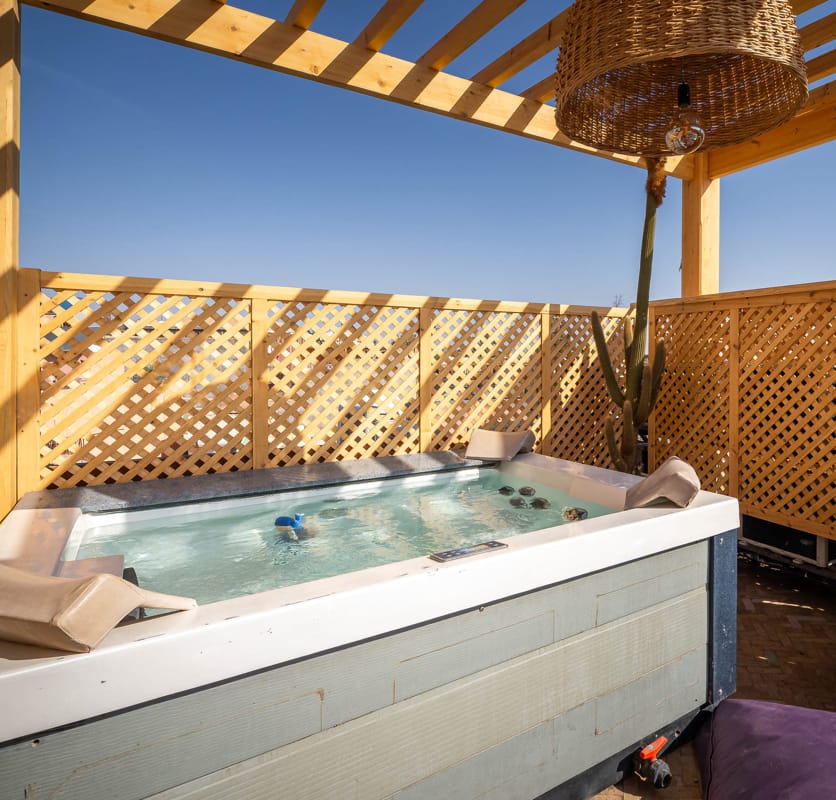 Plongez dans un moment de détente ultime dans notre bain à remous. Laissez-vous envelopper par les eaux chaudes et apaisantes du bain à remous, et sentez vos préoccupations s’envoler. Que ce soit pour vous relaxer après une journée riche en explorations à Marrakech ou pour commencer votre journée en douceur, notre bain à remous vous promet une expérience de bien-être exceptionnelle.
